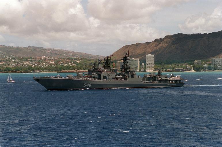 | Keywords: Admiral Panteleyev.jpg The Russian guided missile destroyer ADMIRAL PANTELEYEV passes Diamond Head as part of a parade of ships during the 50th anniversary of V-J Day in celebration of the end of World War II The ADMIRAL PANTELEYEV is homeported at Vladivostok in the Sea of Japan Большой п отиволодочный ко абль Адми ал Пантелеев на па аде посвященном 50-летию победы на Японией у бе егов ост ова Оаху 1 сентяб я 1995 года http //www dodmedia osd mil/DVIC_View/Still_Details cfm SDAN DNSC9700775 JPGPath /Assets/Still/1997/Navy/DN-SC-97-00775 JPG www dodmedia osd mil 1995-09-01 PHCS TERRY COSGROVE PD-USGov-Military-Navy Admiral Panteleev ship 1990 Diamond Head 1995 in Hawaii |