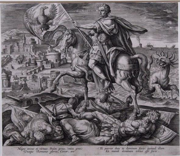 Keywords: Adriaen Collaert - Iulius Caesar.jpg C Iulius Caesar Four Illustrious Rulers of Antiquity Plate 4 Julius Caesar Caesar in armour and with a laurel wreath on horseback bearing a standard depicting an eagle; the horse trampling three kings with standards depicting a lion a ram and a goat; a city in the background to left and the sea to right; a ferocious sea-creature to right rises from the sea towards Caesar; after Maarten de Vos The engraving illustrates the Book of Daniel chapter 7 and 8 Deska 4 Julius Caesar Caesar ve zbroji s vavřínovým věncem sedící na koni a nesoucí standartu s vyobrazením orla Kůň dupe po třech králech se standartami zobrazující lva berana a kozu V pozadí je zleva město a zprava moře s nestvůrou between 1575 1618 engraving etching paper Size cm 25 4 22 2 Institution British Museum object history exhibition history credit line Lettered with C Julius Caesar and M de Vos invent / Ad Coll sculp et excud within image and with Latin verse Magne animo et virtute esse facis below accession number http //www britishmuseum org/research/search_the_collection_database/search_object_details aspx objectid 1522974 partid 1 1948 0410 4 60 The British Museum Custom license marker 2013 03 28 PD-Art-100 Uploaded with UploadWizard Adriaen Collaert Adam Eck - Game casket in Sweden Nationalmuseum Ritual trampling Julius Caesar in art Book of Daniel |