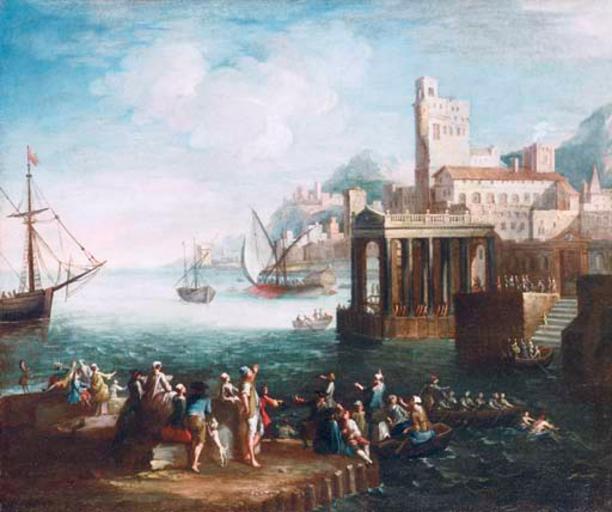 Keywords: Adriaen van der kabel - Capriccio van een Mediterraanse haven.jpg artwork en A capriccio of a Mediterranean port with figures on a quay and shipping beyond date oil on canvas in 24 29 Sold with a photocopy of a letter from Dott Dario Succi dated 9 August 1996 confirming the attribution to Adriaan van der Cabel Christie's online 4360146 1416 18 New York 5 - 6 October 2004 PD-old-100 Attributed to Adriaen van der Kabel |