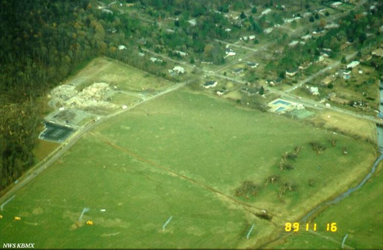 Keywords: Aerial view 5 after the 1989 Huntsville Tornado.jpg en Damage from the November 15 1989 tornado to strike Huntsville Alabama This aerial photograph shows the demolished Jones Valley Elementary School top left looking northwest A section of Jones Farm is enclosed on the west by downed high voltage lines which crossed the hill alongside Carl T Jones Dr Garth Rd on the north Toney Dr on the east and Aldridge Creek on the south Photographed by NWS Birmingham during their storm survey 1989-11-16 http //www srh noaa gov/images/bmx/significant_events/1989/11_15/graphics/ C S;O D National Weather Service Birmingham Alabama office other versions PD-USGov 1989 Huntsville Tornado Aerial photographs of Alabama |