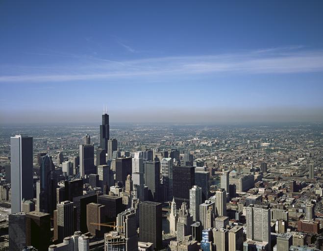 | Keywords: Aerial view of Chicago, Illinois LCCN2011634682.tif 1 transparency color ; 4 x 5 in or smaller Notes Digital image produced by Carol M Highsmith to represent her original film transparency; some details may differ between the film and the digital images ; Forms part of the Selects Series in the Carol M Highsmith Archive ; Gift and purchase; Carol M Highsmith; 2011; DLC/PP-2011 124 ; Title date subject note and keywords provided by the photographer ; The tall black building is Willis Tower formerly and still referred to as the Sears Tower a 108-story skyscraper At the time of its completion in 1973 it was the tallest building in the world ; Credit line Photographs in the Carol M Highsmith Archive Library of Congress Prints and Photographs Division between 1980 2006 Creator Carol M Highsmith Library of Congress Catalog http //lccn loc gov/2011634682 Image download https //cdn loc gov/master/pnp/highsm/16400/16489a tif Original url http //hdl loc gov/loc pnp/highsm 16489 No known restrictions on publication LOC-image highsm 16489 PD-Highsmith Images uploaded by Fæ Photographs by Carol M Highsmith |