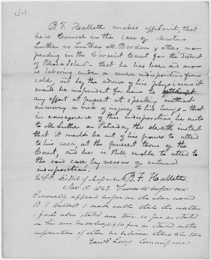 Keywords: Affidavit of B.F. Hallett in the case of Martin Luther v. Luther Borden, et. al. - NARA - 278281.tif Scope and content This document is from the file for the case of Martin Luther v Luther Borden This is a suit for trespass against a group of Rhode Island state militia who acting under martial law broke into Martin Luther's house in the middle of the night searched the premises and threatened its inhabitants Luther claimed that the legislation establishing martial law was void because the charter government which proclaimed martial law was not the legal government of Rhode Island The defendents claimed that the declaration of martial law was legal and that they were acting under the orders of their superior officers when they entered the house to search for Luther who was an important supporter of Thomas W Dorr who had organized a people's government The decision of the US Circuit Court in favor of the defendents was appealed to the US Supreme Court The US Supreme Court however feeling that the case was political in nature refused to rule on the issues and returned the case to the US Circuit Court This case was an important case in the historic events commonly known as the Dorr Thomas W Dorr Rebellion General notes 278281 Local identifier U S Circuit Court for the District of Rhode Island 1790 - 01/01/1912 NARA's Northeast Region Boston NRAAB 380 Trapelo Road Waltham MA 02452-6399 date 1843 11 15 - 1843 11 15 Record group Record Group 21 Records of District Courts of the United States 1685 - 2004 Record group ARC 350 Case Files compiled 11/1790 - 12/1911 Series ARC 278236 File unit Martin Luther v Luther Borden et al 10/06/1842 - 12/1848 File unit ARC 278271 Variant control numbers NAIL Control Number NRAB-21-CASECCRI-24LAW-J yes Other versions NARA-cooperation PD-USGov Luther v Borden |