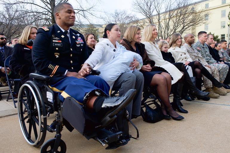Keywords: Afghan Veteran and Family Members Are Honored by Defense Secretary Carter, Afghan President Ghani During Honor Cordon at Pentagon.jpg en Army Captain Jeremy Haynes who nearly died in Afghanistan; his wife Chelsea and their new child Jordan; Susan Myers Greene widow of General Harold Greene killed in Afghanistan; and Mary Ann and Reese Larson whose husband and father Lonn respectively is currently deployed to Afghanistan listen on March 23 2015 as U S Defense Secretary Ash Carter and Afghan President Ashraf Ghani thanked U S government leaders military members and citizens for their support and sacrifices on behalf of the country since 2001 State Department photo/ Public Domain 2015-03-23 07 59 58 http //www flickr com/photos/9364837 N06/16907460822/ U S Department of State other versions 38 871322 -77 055916 PD-USGov PD-USGov Relations of Afghanistan and the United States Uploaded with UploadWizard |