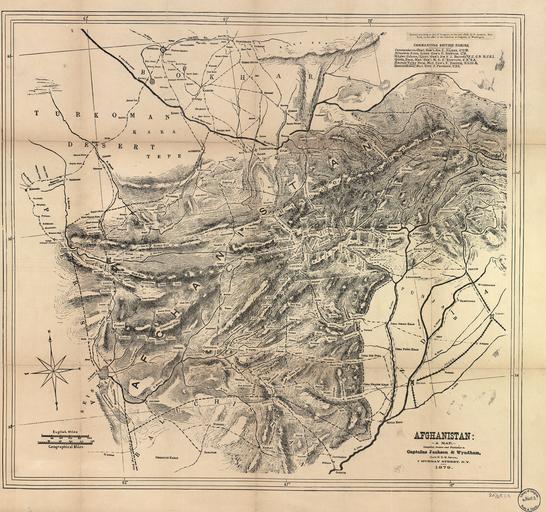 Keywords: Afghanistan- A Map WDL12987.png Artwork ru Джексон П капитан fr Jackson P capitaine en Jackson P Captain zh P· 克 上尉 pt Jackson P Capitão ar جاكسون، بي ، الجنرال es Jackson P capitán ru Ка та Афганистана fr Afghanistan  une carte en Afghanistan A Map zh 阿富汗: 图 pt Afeganistão Um mapa ar أفغانستان خريطة ru Эта ка та выпущенная в 1879 году в ью-Йо ке судя по всему была п извана инфо ми овать аме иканское общество о войнах шедших в то в емя в Афганистане Военный конфликт получивший название Вто ой англо-афганской войны начался в нояб е 1878 года когда Великоб итания ст емясь ог аничить астущее как ей казалось влияние России в Афганистане вто глась в эту ст ану с те ито ии Б итанской Индии Ка та была аз аботана составлена и опубликована капитаном Джексоном и капитаном Уиндемом чьи фамилии соп овождаются словами Late H B M Service означающими недавно на службе Ее Величества то есть б итанской ко олевы Викто ии а ка те показан го ный ельеф Афганистана к упные и малые го ода еки до оги и части Б итанско-Индийской железнодо ожной сети п отянувшейся до те ито ии сов еменного Пакистана В п авом ве хнем углу пе ечислены военачальники б итанских военных фо ми ований об азованных специально для участия в этой войне Судя по ка те это были итанкотское соединение Хайбе ская колонна Кветтское соединение Соединение долины Ку ам и Резе вное соединение под общим командованием гене ала сэ а Ф еде ика Хейнса Вто ая англо-афганская война п одолжалась до сентяб я 1880 года и обе нулась значительными поте ями для обеих сто он <br>Афганские войны; Великоб итания А мия; Военные ка ты fr Cette carte publiée à New York en 1879 visait probablement à informer le public américain sur la guerre qui se déroulait à l'époque en Afghanistan Le conflit appelé la seconde guerre anglo-afghane commença en novembre 1878 lorsque la Grande-Bretagne envahit l'Afghanistan depuis l'Inde britannique afin de freiner l'influence croissante des Russes dans le pays La carte fut compilée dessinée et publiée par les capitaines Jackson et Wyndham uniquement identifiés par la note « Late H B M Service » qui signifie récemment au service de Sa Majesté britannique c'est-à-dire la reine Victoria Elle indique les régions montagneuses d'Afghanistan les villes et villages les fleuves les routes et des parties du réseau ferroviaire indien britannique s'étendant jusqu'en actuel Pakistan Dans l'angle supérieur droit de la carte une liste répertorie les commandants des forces britanniques constituées pour mener la guerre notamment la force armée de Mitankote la colonne de Khyber la force armée de Quetta la force armée de la vallée du Kurram et la force armée de réserve toutes sous le commandement du général sir Frederick Haines La seconde guerre anglo-afghane dura jusqu'en septembre 1880 entraînant de lourdes pertes humaines des côtés britannique et allemand <br>Guerres afghanes; Grande-Bretagne Armée; Cartes militaires en This map published in New York in 1879 appears to have been made to inform American audiences about the war then underway in Afghanistan The conflict which became known as the Second Anglo-Afghan War began in November 1878 when Great Britain invaded Afghanistan from British India in order to check what it perceived as the growth of Russian influence in the country The map was compiled drawn and published by Captains Jackson and Wyndham who are identified only as Late H B M Service meaning recently in the service of Her Britannic Majesty i e Queen Victoria The map shows the mountainous terrain of Afghanistan cities and towns rivers roads and parts of the British-Indian railroad network extending into present-day Pakistan In the upper right are listed the commanding officers of the British forces formed to prosecute the war which the map designates as the Mitankote Force Khyber Column Quetta Force Kurram Valley Force and the Reserve Force all under the overall command of General Sir Frederick Haines The Second Anglo-Afghan War lasted until September 1880 and resulted in heavy casualties on both the British and Afghan sides <br>Afghan Wars; Great Britain Army; Military maps zh 这张 图于 1879 年 纽约出版,似乎是为了让美国读 了解当时正 阿富汗进行的战争 制 这次冲突被称为第二次英国-阿富汗战争, 始于 1878 年 11 ,当时英国为了遏制俄罗斯 阿富汗势力的扩大 从英属印度入侵阿富汗 该 图由 克 Jackson 和温德姆 Wyndham 上尉编纂 绘制和出版,他们的身份信息只 近为英国女王陛下 务 ,意 是 近为英国维多利亚女王 Queen Victoria 陛下 务的人 图上标示了阿富汗的山区 形 城市和城镇 河流 道路以及部分延伸到今巴基斯 的英属印度铁路网 右上方列出了为参加这次战争 组建的英军部队的各指挥官, 图上还标出了这些部队的名称,分别是米 科特部队 伯尔纵
