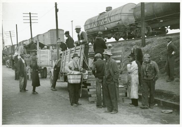 | Keywords: new york public library newyorkpubliclibrary dc:identifier=http://digitalgallery.nypl.org/nypldigital/id?1260216 dc:identifier=httpdigitalgallerynyplorgnypldigitalid1260216 xmlns:dc=http://purl.org/dc/elements/1.1/ xmlns:dc=httppurlorgdcelements11 dc:coverage=1939 day laborers daylaborers memphis tenn. tenn african american agricultural laborers africanamericanagriculturallaborers farm trucks farmtrucks tennessee cotton pickers cottonpickers depression era depressionera Digital ID: 1260216. [African American day laborers standing near and on the back of farm trucks parked on the side of a road near the Hallan Bridge while drivers bid and offer them between 50 cents and one dollar to work as cotton pickers on Mississippi and Arkansas plantations, Memphis, Tennessee, October 1939.. Wolcott, Marion Post -- Photographer. October 1939 Notes: Original negative #: 30631-M5; Caption on back: 'Day laborers being hired for cotton picking on Mississippi and Arkansas plantations. Between about 4 to 6:30 A.M., every morning during the season near the Hallan Bridge in Memphis, Tennessee crowds of negroes in the streets gather and are loaded into trucks by drivers who bid and offer them from 50 cents per day to $1.00. October 1939.' Source: Farm Security Administration Collection. / Tennessee. / Marion Post Wolcott. (more info) Repository: The New York Public Library. Schomburg Center for Research in Black Culture. Photographs and Prints Division. See more information about this image and others at NYPL Digital Gallery. Persistent URL: digitalgallery.nypl.org/nypldigital/id?1260216 Rights Info: No known copyright restrictions; may be subject to third party rights (for more information, click here) Digital ID: 1260216. [African American day laborers standing near and on the back of farm trucks parked on the side of a road near the Hallan Bridge while drivers bid and offer them between 50 cents and one dollar to work as cotton pickers on Mississippi and Arkansas plantations, Memphis, Tennessee, October 1939.. Wolcott, Marion Post -- Photographer. October 1939 Notes: Original negative #: 30631-M5; Caption on back: 'Day laborers being hired for cotton picking on Mississippi and Arkansas plantations. Between about 4 to 6:30 A.M., every morning during the season near the Hallan Bridge in Memphis, Tennessee crowds of negroes in the streets gather and are loaded into trucks by drivers who bid and offer them from 50 cents per day to $1.00. October 1939.' Source: Farm Security Administration Collection. / Tennessee. / Marion Post Wolcott. (more info) Repository: The New York Public Library. Schomburg Center for Research in Black Culture. Photographs and Prints Division. See more information about this image and others at NYPL Digital Gallery. Persistent URL: digitalgallery.nypl.org/nypldigital/id?1260216 Rights Info: No known copyright restrictions; may be subject to third party rights (for more information, click here) Digital ID: 1260216. [African American day laborers standing near and on the back of farm trucks parked on the side of a road near the Hallan Bridge while drivers bid and offer them between 50 cents and one dollar to work as cotton pickers on Mississippi and Arkansas plantations, Memphis, Tennessee, October 1939.. Wolcott, Marion Post -- Photographer. October 1939