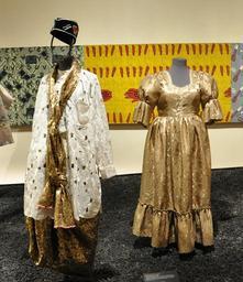 Keywords: African Lace VLM 18.jpg Traditionelle seit etwa 1960 Efik-Gewänder die zu festlichen Anlässen getragen werden und europäische Vorbilder des 19 Jahrhunderts erkennen lassen Links Traditionelles Herren-Ensemble Efik Calabar Nigeria 2008; Industrieller Stickereistoff mit von Hand ausgeschnittenen Löchern Synthetik-Brokatstoff žDamask bestickte Samtteile; Weltmuseum Wien Inv Nr 187 555; 187 556 a b; 187 557 b Rechts Traditionelles Damenkleid žOnyonyon Efik Calabar Nigeria 2008; Synthetik-Brokatstoff; Weltmuseum Wien Inv Nr 187 559 Fotografiert in der Ausstellung Lustenau Lagos African Lace im Vorarlberg Museum own own photograph 2013-08 Wolf D Lustenau Lagos African Lace exhibition Fashion in 2008 Efik artefacts |