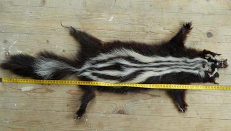 Keywords: African skunk fur-skin (striped polecat (Ictonyx striatus), also called the African polecat, zoril, zorille, zorilla, Cape polecat).jpg Zorilla-Fell Bandiltis In Privatbesitz photo 2014-11 Kürschner <span class signature-talk ></span> 17 55 29 November 2014 UTC Kürschner Striped polecat fur-skins |