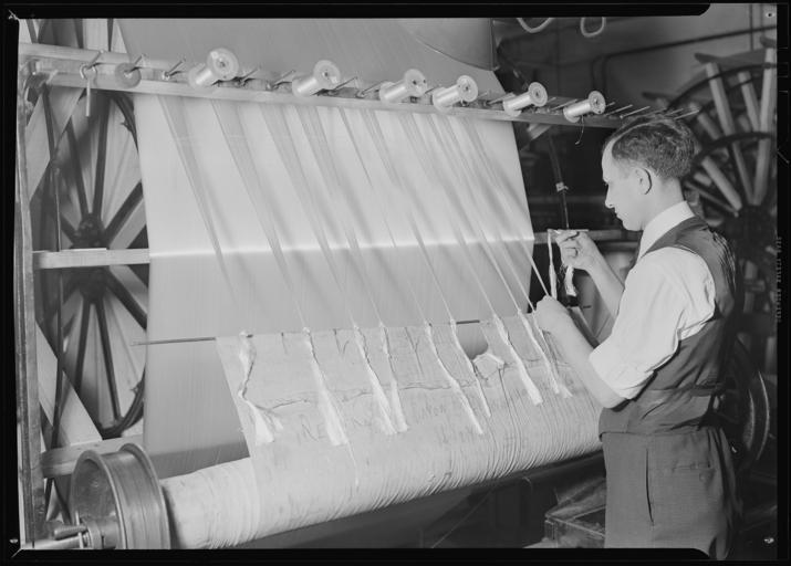 Keywords: nara:arcid=518558 u.s. national archives usnationalarchives lewis hine lewishine 1937 paterson new jersey newjersey the great depression thegreatdepression blackandwhite monochrome photo border black and white Original Caption: Paterson, New Jersey - Textiles. After all the sections required for the warp have been wound on to the frame, the ends are ready to be wound from the frame onto the beam. The operator is shown tying the ends of the section on to the beam paper. The paper is used on beams having no flanges to keep the warp threads in position on the beam, March 1937 U.S. National Archives’ Local Identifier: 69-RP-319 Photographer: Hine, Lewis Subjects: The New Deal Tennessee Valley Authority Works Progress Administration Work Portraits The Great Depression Persistent URL: research.archives.gov/description/518558 Repository: Still Picture Records Section, Special Media Archives Services Division (NWCS-S), National Archives at College Park, 8601 Adelphi Road, College Park, MD, 20740-6001. For information about ordering reproductions of photographs held by the Still Picture Unit, visit: www.archives.gov/research/order/still-pictures.html Reproductions may be ordered via an independent vendor. NARA maintains a list of vendors at www.archives.gov/research/order/vendors-photos-maps-dc.html Access Restrictions: Unrestricted Use Restrictions: Unrestricted Original Caption: Paterson, New Jersey - Textiles. After all the sections required for the warp have been wound on to the frame, the ends are ready to be wound from the frame onto the beam. The operator is shown tying the ends of the section on to the beam paper. The paper is used on beams having no flanges to keep the warp threads in position on the beam, March 1937 U.S. National Archives’ Local Identifier: 69-RP-319 Photographer: Hine, Lewis Subjects: The New Deal Tennessee Valley Authority Works Progress Administration Work Portraits The Great Depression Persistent URL: research.archives.gov/description/518558 Repository: Still Picture Records Section, Special Media Archives Services Division (NWCS-S), National Archives at College Park, 8601 Adelphi Road, College Park, MD, 20740-6001. For information about ordering reproductions of photographs held by the Still Picture Unit, visit: www.archives.gov/research/order/still-pictures.html Reproductions may be ordered via an independent vendor. NARA maintains a list of vendors at www.archives.gov/research/order/vendors-photos-maps-dc.html Access Restrictions: Unrestricted Use Restrictions: Unrestricted