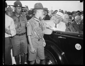 Keywords: After leaving the all-state game today President Roosevelt motored to the National Jamboree 47343v.jpg Title President decorates Duchess County scout July 7 After leaving the all-state game today President Roosevelt motored to the National Jamboree of the Boy Scouts where he visited the camp of the Duchess County NY scouts He is shown pinning the award of Eagle Scout on Frankly St John Troop 7 of Poughkeepsie N Y In the car with the Chief Executive are James L West center Chief Scout Executive; and Dan Beard oldest member of the scouts 7/7/37 Creator s Harris Ewing photographer 1937 July 7 Medium 1 negative glass 4 x 5 in or smaller accession number Reproduction Number LC-DIG-hec-47343 digital file from original negative Rights Advisory No known restrictions on publication Call Number LC-H21- C-760 P P institution Library of Congress Prints and Photographs Division Washington D C 20540 USA http //hdl loc gov/loc pnp/pp print Title from unverified caption data on negative or negative sleeve Gift; Harris Ewing Inc 1955 General information about the Harris Ewing Collection is available at http //hdl loc gov/loc pnp/pp hec LOC-image hec 47343 http //www loc gov/pictures/search/ q Boy 20Scout 20Jamboree Harris Eweing PD-Harris-Ewing Franklin Delano Roosevelt in 1937 1937 National Scout Jamboree 1937 in Washington D C Uploaded with VicuñaUploader |