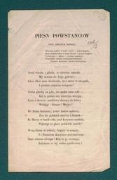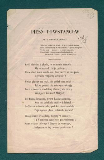 Keywords: AGAD (12) Pieśń Przy Zimowem Ognisku, PudÅ‚o 663 s. 139.png Pieśń powstaÅ„ców žPrzy zimowem ognisku autorstwa Konstantego GaszyÅ„skiego <br /> Konstanty GaszyÅ„ski 1809-1866 poeta prozaik syn Antoniego i Tekli Bzowskiej urodziÅ‚ siÄ™ 10 III w Jeziornej w ówczesnym powiecie radomskim wg Korbuta w MaÅ‚ej Wsi koÅ‚o Czerska Liceum ukoÅ„czyÅ‚ w Warszawie Od 1828 r studiowaÅ‚ prawo na Uniwersytecie Warszawskim ByÅ‚ przyjacielem Zygmunta KrasiÅ„skiego dziÄ™ki któremu poznaÅ‚ Å›wiat literacki Warszawy WydawaÅ‚ wspólnie z kolegami žPamiÄ™tnik dla PÅ‚ci PiÄ™knej W powstaniu listopadowym byÅ‚ podporucznikiem akademickiej gwardii honorowej potem porucznikiem saperów NapisaÅ‚ wiele pieÅ›ni powstaÅ„czych i patriotycznych ByÅ‚ czÅ‚onkiem Towarzystwa Patriotycznego WziÄ…Å‚ udziaÅ‚ w wyprawie gen GieÅ‚guda na LitwÄ™ i 17 VII 1831r przeszedÅ‚ z nim do Prus W lutym 1832 r przybyÅ‚ do Francji NależaÅ‚ poczÄ…tkowo do zakÅ‚adu wojskowego w Awinionie skÄ…d udaÅ‚ siÄ™ do Marsylii W 1832 r byÅ‚ czÅ‚onkiem Komitetu Narodowego Polskiego a od 1833 r Towarzystwa Historyczno-Literackiego W 1833 r wydaÅ‚ žNotatki oficera polskiego o obchodzeniu siÄ™ rzÄ…du pruskiego z korpusem wojska polskiego w czasie 53 dni trwajÄ…cej kwarantanny Od koÅ„ca 1833 r mieszkaÅ‚ w Aix-en-Provence PisywaÅ‚ do miejscowej prasy francuskiej žGazette du Midi žMemorial d ™Aix tÅ‚umaczyÅ‚ poetów angielskich francuskich i niemieckich wydawaÅ‚ też dzieÅ‚a KrasiÅ„skiego W 1844 r przybyÅ‚ do Paryża gdzie byÅ‚ sekretarzem deputowanego Leona de Sieyesa Latem 1860 r odwiedziÅ‚ rodzinÄ™ w Królestwie 2 III 1862 r podpisaÅ‚ akt zaÅ‚ożenia Stowarzyszenia Podatkowego którego zostaÅ‚ czÅ‚onkiem ZmarÅ‚ 8 X 1866 r w Aix-en-Provence i zostaÅ‚ pochowany na miejscowym cmentarzu Grobowiec jego zostaÅ‚ odnowiony staraniem Paula Cazin PrzeszedÅ‚ do historii literatury jako przyjaciel KrasiÅ„skiego tÅ‚umaczÄ…c jego utwory na jÄ™zyk francuski ZasÅ‚ynÄ…Å‚ jako autor piosenek powstaÅ„czych oraz zbioru poezji wydanych drukiem pt žKilka pieÅ›ni dla kraju -1864 žPoezje - 1856 Pieśń žCzarna sukienka cieszyÅ‚a siÄ™ swego czasu dużą popularnoÅ›ciÄ… UprawiaÅ‚ gatunki rozpowszechnione w romantyzmie pisaÅ‚ ballady obrazki poetyckie z powstania sonety Poezja jego ujmuje szlachetnoÅ›ciÄ… jÄ™zyka Å›wieżoÅ›ciÄ… uczuć a przede wszystkim patriotyzmem Zbiór jego pieÅ›ni Adam Mickiewicz nazwaÅ‚ žbukietem piÄ™knych kwiatów rzuconym na bruk paryski Prezentowana tu pieśń powstaÅ„ców žPrzy zimowem ognisku opowiada o niedoli i mÄ™czeÅ„stwie narodu polskiego który nie poddaÅ‚ siÄ™ mimo zniewolenia utraty niepodlegÅ‚oÅ›ci i braku reakcji ze strony zachodnich paÅ„stw europejskich WalczyÅ‚ o wolność wszelkimi możliwymi sposobami PotrafiÅ‚ przeciwstawić siÄ™ okrutnemu groźnemu i uzbrojonemu w wielkÄ… armiÄ™ zaborcy Nie straciÅ‚ nadziei żarliwie modliÅ‚ siÄ™ do Boga jedynego w tych czasach sprzymierzeÅ„ca WierzyÅ‚ że w koÅ„cu nadejdzie dzieÅ„ zwyciÄ™stwa i odżyje ukochana ojczyzna Wiersz w sposób sugestywny przedstawia cierpienia narodu polskiego mimo to nastraja pozytywnie ponieważ daje wiarÄ™ Polakom na lepsze jutro MuzykÄ™ do wiersza napisaÅ‚ Ferdynand Kwestyn Dulcken profesor Instytutu Muzycznego w Warszawie <br /> Miejsce Paryż<br /> Opis zewnÄ™trzny Druk j polski 1 karta o wymiarach 210x140 mm ss 2; drukarnia E Marinet w Paryżu<br /> Miejsce przechowywania Biblioteka Polska w Paryżu RzÄ…d Narodowy powstania 1863-1864 Archiwum Izby Obrachunkowej sygn 663 s 139<br /> Autor komentarza MaÅ‚gorzata Osiecka 1863-12-17 Archiwum Główne Akt Dawnych Konstanty GaszyÅ„ski PD-old January Uprising documents Media contributed by AGAD presented in former polska pl portal Uploaded with VicuñaUploader |