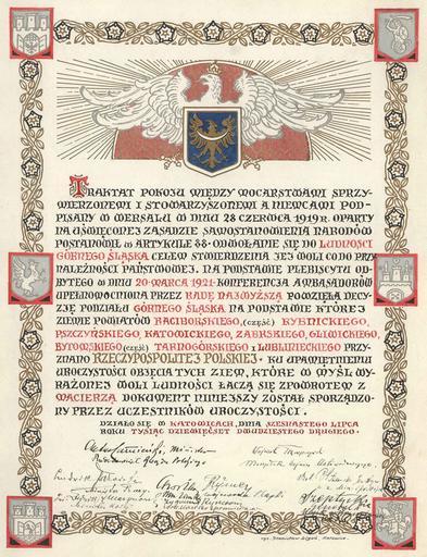 | Keywords: AGAD Akt pamiÄ…tkowy połączenia Górnego ÅšlÄ…ska z RzeczÄ…pospolitÄ….jpg Akt podpisany podczas uroczystoÅ›ci połączenia Górnego ÅšlÄ…ska z PolskÄ… która odbyÅ‚a siÄ™ w katowickim parku im T KoÅ›ciuszki z udziaÅ‚em delegacji wÅ‚adz paÅ„stwowych i miejscowego spoÅ‚eczeÅ„stwa 20 X 1921 po plebiscycie i trzech kolejnych powstaniach wielkie mocarstwa podjęły decyzjÄ™ o podziale Górnego ÅšlÄ…ska na część polskÄ… i niemieckÄ… Decyzja zobowiÄ…zaÅ‚a PolskÄ™ i Niemcy do wynegocjowania warunków o tzw okresie przejÅ›ciowym miaÅ‚ obowiÄ…zywać przez 15 lat i ochronie praw mniejszoÅ›ci narodowych na górnoÅ›lÄ…skim obszarze plebiscytowym StosownÄ… umowÄ™ zwanÄ… KonwencjÄ… GenewskÄ… obie strony podpisaÅ‚y 15 V 1922 Po miesiÄ…cu mogÅ‚y przystÄ…pić do faktycznego obejmowania przyznanych im części 16 VII w katowickim Parku KoÅ›ciuszki odbyÅ‚a siÄ™ uroczystość zespolenia ziemi Å›lÄ…skiej z RzeczÄ…pospolitÄ… W uroczystoÅ›ci uczestniczyÅ‚a delegacja polskich wÅ‚adz paÅ„stwowych i miejscowe spoÅ‚eczeÅ„stwo ZbiegÅ‚a siÄ™ ona jednak z kryzysem gabinetowym Po dymisji rzÄ…du Antoniego Ponikowskiego prawica sejmowa wysunęła na stanowisko premiera Wojciecha Korfantego do niedawna komisarza plebiscytowego Kandydaturze tej sprzeciwiÅ‚ siÄ™ Naczelnik PaÅ„stwa Józef PiÅ‚sudski W tej sytuacji PiÅ‚sudski i Korfanty uznali swój przyjazd do Katowic za niepożądany Na uroczystoÅ›ci odczytano akt symbolicznego połączenia Górnego ÅšlÄ…ska z PolskÄ… Akt podpisaÅ‚o ponad 100 osób WidniejÄ… pod nim m in podpisy nastÄ™pujÄ…cych osób Wojciech TrÄ…mpczyÅ„ski “ marszaÅ‚ek Sejmu Ustawodawczego generaÅ‚ StanisÅ‚aw Szeptycki “ dowódca wojsk polskich wkraczajÄ…cych na Górny ÅšlÄ…sk generaÅ‚ Kazimierz Horoszkiewicz “ dowódca 23 Dywizji Piechoty dr Jerzy Buzek “ radca Prezydium Rady Ministrów StanisÅ‚aw Gall “ biskup polowy wojska polskiego Józef Rymer “ wojewoda Å›lÄ…ski Zygmunt Å»urawski “ wicewojewoda Å›lÄ…ski Konstanty Wolny “ adwokat przyszÅ‚y marszaÅ‚ek Sejmu ÅšlÄ…skiego <br /> Opis zewnÄ™trzny OryginaÅ‚ jÄ™z polski 64x49 cm<br /> Miejsce przechowywania Archiwum PaÅ„stwowe w Katowicach UrzÄ…d Wojewódzki ÅšlÄ…ski w Katowicach sygn 19<br /> Autor komentarza Edward DÅ‚ugajczyk<br /> Autor Fotografii/Skanu Piotr Matuszek 1922-07-16 Archiwum Główne Akt Dawnych author PD-old Upper Silesia plebiscite Media contributed by AGAD presented in former polska pl portal Uploaded with VicuñaUploader |