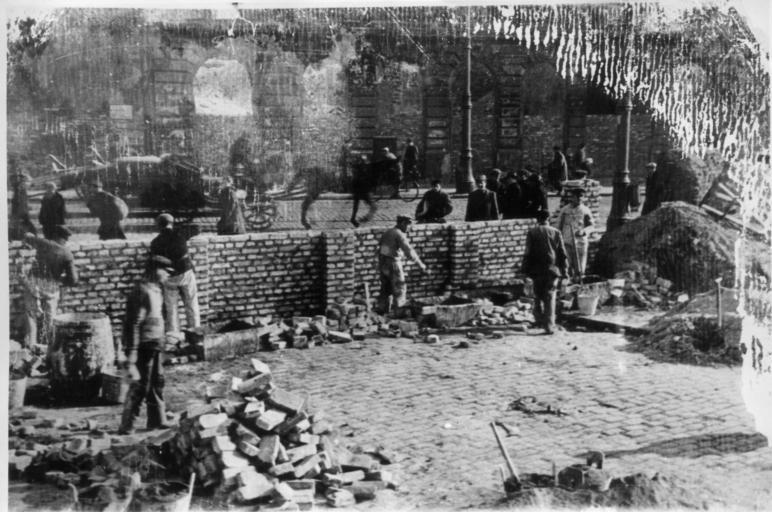 Keywords: AGAD APW Budowa muru getta.jpg Robotnicy wznoszący mur getta W tle ruch uliczny Fotografia została wykonana prawdopodobnie na polecenie Judenratu w 1940 lub 1941 Autor fotografii nieznany <br /> Komentarz <br /> Podczas II wojny światowej na terenach okupowanych państw Niemcy tworzyli w miastach żydowskie dzielnice mieszkaniowe potocznie zwane gettami Pierwsze getta powstały już w 1939 m in w Piotrkowie Początkowo nie były zamknięte Od 1940 zaczęto je otaczać murem lub drutem kolczastym a mieszkańcy pod groźbą śmierci nie mogli ich opuszczać bez zezwolenia władz niemieckich Getto w Warszawie utworzone zostało 26 XI 1940 na podstawie zarządzenia Ludwiga Fischera niemieckiego gubernatora dystryktu warszawskiego z dnia 2 X 1940 Obejmowało obszar ok 400 ha w północno zachodniej części miasta otoczony murem Na obszarze tym stale uszczuplanym przebywało początkowo ponad 400 tys ludzi Jeszcze przed formalnym utworzeniem getta od wiosny 1940 zaczęto wznosić pierwsze mury zamykające wyloty niektórych ulic Na przełomie 1940/1941 cały obszar getta został szczelnie ogrodzony murem Od listopada 1940 Żydom zakazano przebywania na zwenątrz murów Wyjątkiem były osoby wykonujące prace poza obszarem getta W ciągu kilku tygodni przemieszczono na jego teren 130 tys Żydów z innych dzielnic Warszaway a także z miasteczek podwarszawskich natomiast z getta wysiedlono 113 tys Polaków W związku z wprowadzeniem przez Niemców 1 XII 1939 obowiązku noszenia przez Żydów specjalnych opasek z gwiazdą Dawida na ulicach getta spotykało się sprzedawców takich opasek W getcie Niemcy utworzyli Radę Żydowską Judenrat oraz policję żydowską Przewodniczącym Judenratu został inżynier Adam Czerniakow a po jego samobójczej śmierci 24 VII 1942 inżynier Marek Lichtenbaum Obszar getta był stale uszczuplany Po wyłączeniu w X-XI 1941 niektórych ulic getto zostało podzielone na dwie części większą na północ od ul Chłodnej i mniejszą tzw małe getto na południe od tej tej ulicy Obie części połączone były pomostem nad aryjską ulicą Chłodną 10 sierpnia 1942 z wyjątkiem niewielkiej enklawy małe getto zostało praktycznie zlikwidowane Na przełomie 1942/1943 pozostało już tylko kilka niedużych pooddzialanych terenów zwanych gettami szczątkowymi Od marca 1942 Niemcy rozpoczęli likwidację getta warszawskiego organizując pierwsze transporty jego mieszkańców do obozów zagłady głównie w Treblince Do końca 1942 deportowano a następnie wymordowano ponad 300 tys ludzi Przeciwko niemieckiej polityce zagłady narastał opór W getcie powstały 2 organizacje zbrojne Żydowski Związek Wojskowy i Żydowska Organizacja Bojowa Jej komendantem był Mordechaj Anielewicz <br /> Opis zewnętrzny oryginał fotografia 172 x 115 mm brak pieczęci i podpisów 1 karta 1 strona <br /> Miejsce przechowywania Archiwum Państwowe m st Warszawy Zbiór fotografii z II wojny światowej 1939 1945 sygnatura IX 4/8<br /> Autor komentarza Jan Członkowski<br /> Autor fotografii skanu Mariusz Ładno 1940 1941 Archiwum Główne Akt Dawnych author PD-old Warsaw Ghetto Media contributed by AGAD presented in former polska pl portal Uploaded with VicuñaUploader |