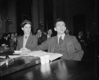 Keywords: Agnes Reynolds and Joseph P Lash 1939.jpg en Before Dies Committee Washington D C Dec 1 1939 The Dies Committee Investigating un-American activities today questioned Joseph P Lash Executive Secretary of the American Students' Union and Miss Agnes Reynolds College Secretary of the Union Lash testified that he was a member of the Socialist Party from 1929 to 1937 He said he resigned because he believed that the Socialist Party was subordinating the interests of the people of a whole to the interests of factional strife http //hdl loc gov/loc pnp/hec 27744 Harris and Ewing 1939-12-01 PD-Harris-Ewing Files by User Cuppysfriend 1939 in Washington D C Committees of the United States House of Representatives |