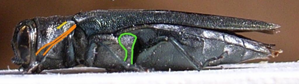 Keywords: Agrilus ater draw.JPG Agrilus ater Seite <br>orange doppelte Seitenrandkante des Halsschildes <br>ocker Kiel am Hinterwinkel des Halsschildes <br>grün Hinterhüfte Photo made by myself 2007-10-08 Siga Public domain Agrilus ater