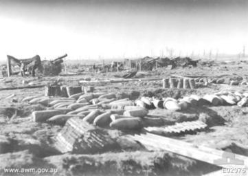 | Keywords: AIF8inchHowitzerBatteryBirrCrossRoads26September1917.jpeg The 1st Australian Siege Battery of six 8 inch howitzers in position at Birr Cross Roads during the ranging of the battery preparatory to the further attack on Polygon Wood on 28 September following which the guns moved forward The Battery evacuated the position on 29 September 1917 On the morning of the attack at about 0530 hours - half an hour before our zero at 0600 hours - the enemy heavily shelled this position; hit luckily without material damage to the guns; but four of the personnel were wounded This was caused as the men were proceeding from their dugouts to the guns in order to open the attack barrage <p>The officer standing between the first and second gun is http //deepthought hass adfa edu au 8080/showPerson pid 322543 Lieutenant W W Whittle Royal Australian Artillery a section officer of the Battery The No 2 man beside No 2 gun is http //deepthought hass adfa edu au 8080/showPerson pid 304583 518 Gunner Harold Alexander Triggs killed by shellfire 5 July 1918 when the same battery was in action near La Motte <p>This is an original Paget Plate negative The same image is available in colour and is held at P03631 200 <br>See Battle of Polygon Wood <br>NOTE This version of the photograph has brightness and contrast artificially increased to highlight details E02076 1917-09-26 Frank Hurley Copyright clear PD-AustraliaGov watermark World War I Photographs by Frank Hurley BL 8 inch Howitzer Mk VI - VIII World War I forces of Australia in Belgium Ypres 1917 Battle of Polygon Wood Black and white photographs of war |