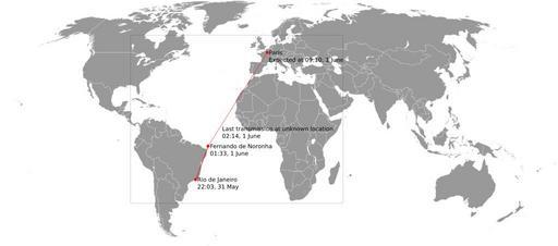 Keywords: Air France Flight 447 path.svg Air France Flight 447 on 31 May/1 June 2009 The solid red line indicates the actual flight path while the dotted line shows the predicted flight path fr Trajet du vol Air France 447 qui s'est déroulé durant la nuit du 31 mai/1er juin de Strecke des Air France-Fugs 447 am 31 Mai/1 Juni 2009 Englischsprachige Beschriftung Air France - Voo 447 - feito na madrugada de 31 de maio para 1 de junho A linha vermelha contínua mostra a rota que o avião deveria seguir e a linha tracejada é a rota prevista para depois do ponto onde o radar perdeu contato com o avião Own work by uploader with help from http //news bbc co uk/1/hi/world/americas/8076848 stm French plane lost in ocean storm Jolly Janner 2009-06-01 <gallery> File Air France Flight 447 path png Bitmap File Plan de vol AF447 png En français </gallery> Other fields + Maps AF447 2009-05-31 overnight 2009-06-01 flight paths |