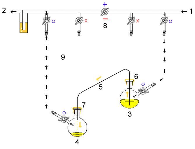 | Keywords: Air sensitive cannula - no bleed valve.png Air sensitive cannula - no bleed valve 1 Pressure in gas in 2 Pressure out oil bubbler orange 3 Higher flask with transfer liquid yellow to transfer 4 Lower receiving flask/transfered liquid yellow 5 Liquid transfer cannula 6 Septum orange on transfer flask 7 Septum orange on receiving flask 8 Pressure-control regulator/stopcock 9 Tubing/ gas-line not shown for clarity arrows show connectivity <font color blue>O</font> Open stopcock; <font color red>X</font> Closed stopcock; black-arrow Gas flow direction orange arrow Liquid flow direction <br> Note As the Pressure-control regulator/stopcock 8 is gradually cloased pressure gradually builts up in flask 3 containing the fluid to be transferred Own Quantockgoblin Chemistry Cannula transfer |