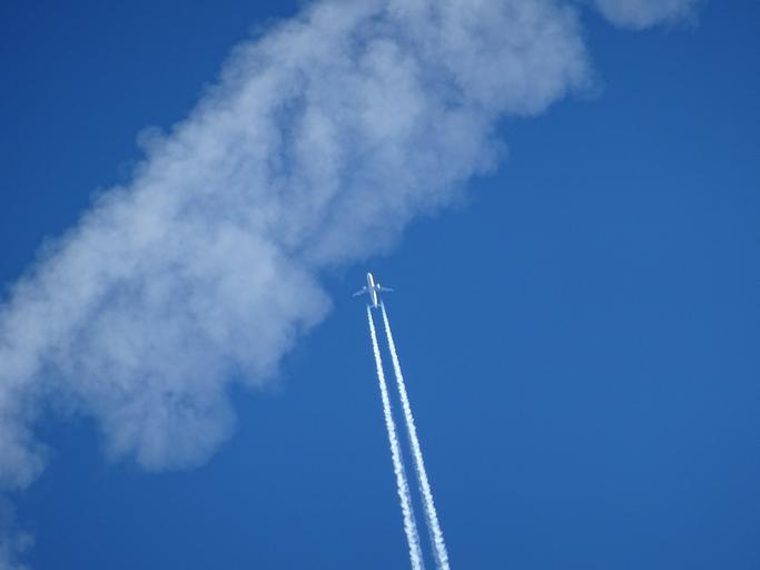 Keywords: aircraft clouds contrail sky blue clear air atmosphere flyer passenger aircraft flight