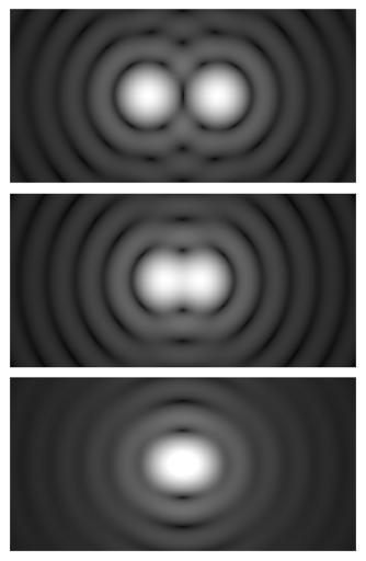 | Keywords: Airy disk spacing near Rayleigh criterion.png en Two airy disks at various spacings top twice the distance to the first minimum middle exactly the distance to the first minimum the Rayleigh criterion and bottom half the distance This image uses a nonlinear color scale specifically the fourth root in order to better show the minima and maxima дисков Э и Эй и асположенных на асстояниях по ядка п едела Э и Ве х на асстоянии диамет а диска Э и Се едина на асстоянии адиуса диска Э и и из на асстоянии в половину адиуса диска Э и В изоб ажении п именена нелинейная шкала я кости чтобы лучше показать минимумы и максимумы own Spencer Bliven 2014-03-05 Source Code The three images were created in R then cropped and assembled using GIMP navbox collapsible collapsed style text-align left; border 0px; margin-top 0 2em; - style background d0e5f5; border 1px solid abd5f5 R source code - click on the right to view - airydisks_rayleigh_sqrt py - border solid 1px silver; padding 8px; background-color white; <source lang rsplus > /usr/bin/env Rscript Diffraction pattern for two airy disks illustrating the Rayleigh criterion Released to Public Domain by Spencer Bliven x seq -5 5 01 y seq -5 5 01 airy <- function xx yy x1 y1 r<-sqrt xx-x1 2+ yy-y1 2 1 22 pi z 2 besselJ r 1 /r 2 z diffractionPlot function spacing 1 useRaster F z1 outer x y FUN function xx yy airy xx yy -spacing/2 0 z2 outer x y FUN function xx yy airy xx yy spacing/2 0 z1is na z1 1 0 z2is na z2 1 0 z z1+z2 grad grey 0 2 16 /2 16 par pty s Non-linear z scale to increase contrast image x y z 1/4 zlim c 0 1 col grad axes F useRaster useRaster png airy_0 5 png bg FFFFFF00 diffractionPlot 5 dev off png airy_1 0 png bg FFFFFF00 diffractionPlot 1 dev off png airy_2 0 png bg FFFFFF00 diffractionPlot 2 dev off </source> Airy disks Images_with_R_source_code |