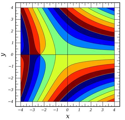 Keywords: AiryAi Arg Contour.svg A graph of the argument of the Airy Ai function over the complex plane <br> <math>f x \mathrm arg \left \mathrm Ai x + iy \right \ </math><br> Both x and y run from -4 to 4 self-made Inkscape Mathematica 06/03/2008 Inductiveload Mathematica Code <pre><nowiki> conts ContourPlot ArgAiryAix + I y x -4 4 y -4 4 ContourShading -> False Contours -> 9 Frame -> False PlotPoints -> 100 </nowiki></pre> Airy function with complex arguments |