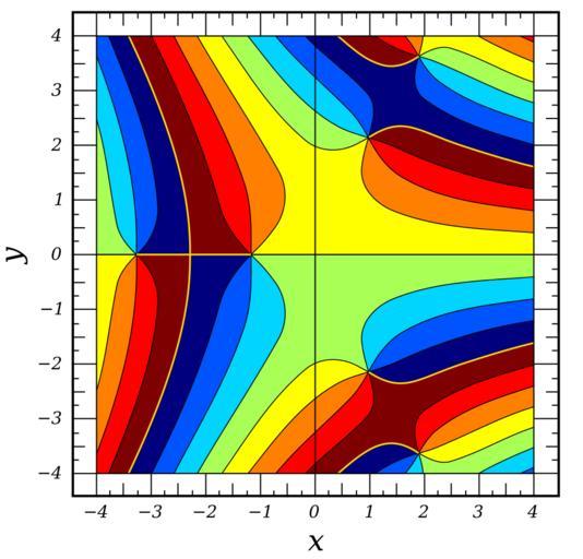 Keywords: AiryBi Arg Contour.svg A contour plot of the argument of the Airy function <br> <math>\mathrm arg \left \mathrm Bi x + iy \right \ </math><br> x and y both run from -4 to 4 self-made Mathematica 07/03/2008 Inductiveload Mathematica Code <pre><nowiki> conts ContourPlot ArgAiryBix + I y x -4 4 y -4 4 ContourShading -> False Contours -> 7 Frame -> False PlotPoints -> 100 </nowiki></pre> Airy function with complex arguments Contour plots |