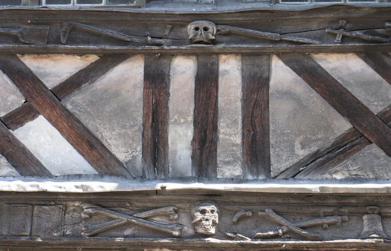 Keywords: Aître Saint-Maclou Rouen 2009 4.jpg L'école régionale des Beaux-Arts de Rouen est située dans un ancien charnier aître Saint-Maclou own photo 2009-08-15 Man vyi Own work all rights released Public domain Aître Saint-Maclou Skull and crossbones Bones in art Human skulls in art Sculptures of tools |