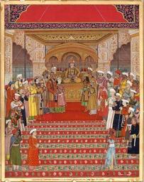 Keywords: Akbar II in durbar.jpg en Painting opaque water colour and gold on paper Akbar II 1759-1837 r 1806-1837 in durbar holding court in the Diwan-i Khas of the Palace at Delhi This painting shows the emperor surrounded by the princes of the blood royal and on either side the nobles of the court Victoria and Albert Museum number 03535 IS http //collections vam ac uk/item/O397639/akbar-ii-1759-1837-r1806-painting-unknown/ author 1830 PD-Art-100 Akbar II Mughal art in the Victoria and Albert Museum Peacock Throne |
