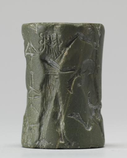 Keywords: Akkadian - Cylinder Seal with King or God and Vanquished Lion - Walters 42674 - Side B.jpg The scene on this seal features a central motif of a tree On one side a bearded hero is holding an inverted bovid; on the other a bull man is holding an inverted lion There are cuneiform inscriptions running through the scene in two places La escena en este sello muestra un adorno central de un árbol Por un lado un héroe barbudo esta sujetando un bóvido invertido por el otro lado un hombre toro esta sujetando un león invertido Hay inscripciones cuneiformes a lo largo de la escena en dos áreas date Old Akkadian green stone Diam cm 2 1 accession number 42 674 4594 Sadie Jones Mrs Henry Walters New York date and mode of acquisition unknown Sale Joseph Brummer New York 1941 Walters Art Museum 1941 by purchase Museum purchase 1941 Inscription place of origin Egypt Walters Art Museum license Akkadian cylinder seals Cylinder seals in the Walters Art Museum Bulls in art Bull of Heaven Gilgamesh Epic of Gilgamesh Animals in art of the ancient Near East Walters cylinder seal 42674 Cuneiform on cylinder seals Walters Art Museum cylinder seals with cuneiform Media contributed by the Walters Art Museum needs category review Master of Animals |