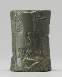Keywords: Akkadian - Cylinder Seal with King or God and Vanquished Lion - Walters 42674 - Side E.jpg The scene on this seal features a central motif of a tree On one side a bearded hero is holding an inverted bovid; on the other a bull man is holding an inverted lion There are cuneiform inscriptions running through the scene in two places La escena en este sello muestra un adorno central de un árbol Por un lado un héroe barbudo esta sujetando un bóvido invertido por el otro lado un hombre toro esta sujetando un león invertido Hay inscripciones cuneiformes a lo largo de la escena en dos áreas date Old Akkadian green stone cm 2 1 accession number 42 674 4594 Sadie Jones Mrs Henry Walters New York date and mode of acquisition unknown Sale Joseph Brummer New York 1941 Walters Art Museum 1941 by purchase Museum purchase 1941 Inscription place of origin Egypt Walters Art Museum license Akkadian cylinder seals Cylinder seals in the Walters Art Museum Lions in art of the ancient Near East Animals in art of the ancient Near East Trees in art of the ancient Near East Walters cylinder seal 42674 Cuneiform on cylinder seals Walters Art Museum cylinder seals with cuneiform Media contributed by the Walters Art Museum needs category review |
