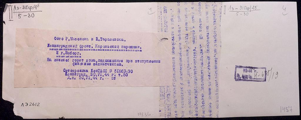 | Keywords: Заглавие:Горящие дома, подожженные финнами при отступлении на Выборг. 20 июня 1944 г. [фотография] Место издания:Ленинград Издательство:ЛенТАСС Дата издания:1944 Физическое описание:1 л. Библиотечный фонд:Российская Национальная Библиотека <a href="https://vivaldi.nlr.ru/al000001064/details" rel="nofollow">vivaldi.nlr.ru/al000001064/details</a> photo wwii 1944 vyborg фотография выборг втораямироваявойна великаяотечественнаявойна рнб электронныйресурсрнб лентасс | ||||