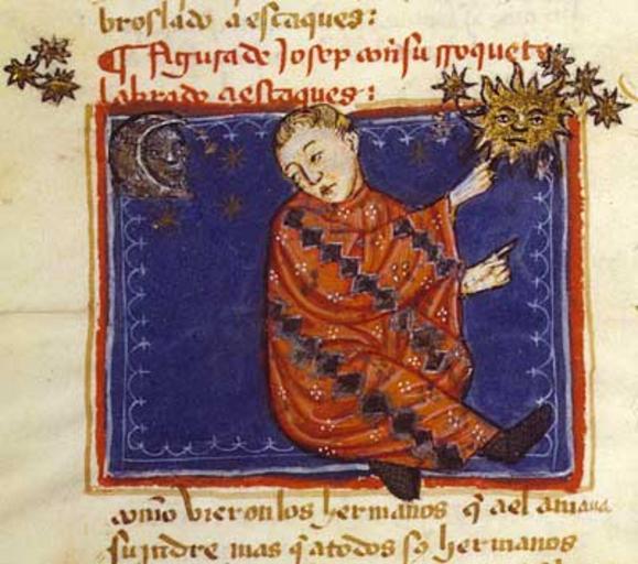 | Keywords: Alba Bible 49r.l.jpg en The second dream of Joseph who wears the coat his father gave him The caption written before the miniature was made reads 'Figura de Josep con su rroquete labrado a escaques' 'Picture of Joseph with his checked cloak' In this the first miniature of the Joseph cycle Joseph is seated in the middle of a square field one leg folded under him He is wearing a long orange robe with white flecks and silver checks The silvery moon to the left and the golden sun to the right have faces and are surrounded by golden stars both inside and outside the frame of the miniature Joseph's head is turned towards the moon and his body towards the sun He holds out one hand to the sun and points to the right with the other towards the first dream illustrated in the second text column 1422 http //www facsimile-editions com/en/ab/ The Alba Bible author PD-old-100 Alba Bible Uploaded with UploadWizard Joseph son of Jacob |