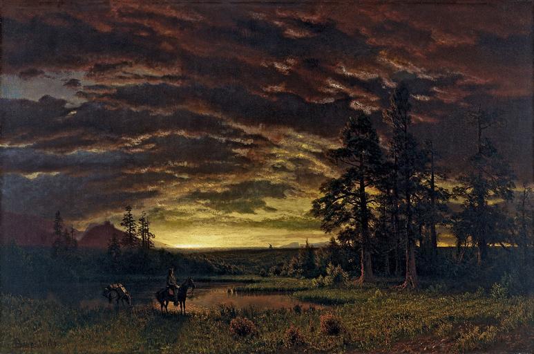 Keywords: albert bierstadt painting art artistic artistry oil on canvas landscape sky clouds nature outside country countryside trees scenic pond lake man horses sunset water forest woods