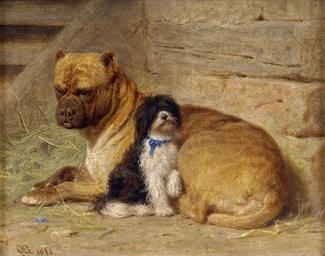 Keywords: Albert Ernst Becker Mesalliance 1871.jpg Monogrammiert Datiert 1871 Öl auf Leinwand 1871 Oil on canvas cm 26 33 institution http //www duesseldorfer-auktionshaus de/ 2011/1 other versions PD-old-100 Images from Düsseldorfer Auktionshaus Albert Ernst Becker 19th-century paintings location missing 1871 paintings 19th-century oil on canvas paintings 19th-century paintings of dogs |