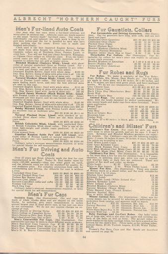 | Keywords: Albrecht's Fur Facts & Fashion 1912-13, Saint Paul, Minnesota -65.jpg Albrecht's Fur Facts Fashion 1912-13 Saint Paul Minnesota Albrecht's Fur Facts Fashion 1912-13 Saint Paul Minnesota - jpg 64 67 File Albrecht's Fur Facts Fashion 1912-13 Saint Paul Minnesota -66 jpg Collection Kuhn 1912 Albrecht's Fur Saint Paul Minnesota PD-old Albrecht's Fur Facts Fashion 1912-13 Saint Paul Minnesota Fur linings Fur gloves Fur carpets Male fur headgear Children with fur Musquash fur advertising Marmot fur advertising Mink fur advertising Fur pieces advertising Otter fur advertising Sable fur advertising Beaver fur advertising Raccoon fur advertising Domestic dog fur advertising Rabbit fur advertising Astrakhan fur advertising Karakul fur advertising Tiger fur advertising Leopard fur advertising Bear fur advertising Goat fur advertising Wolf fur advertising Krimmer fur advertising Sheepskin advertising Tibet lamb fur advertising Pony fur advertising Squirrel fur advertising Fox fur advertising Hare fur advertising Wild cat fur advertising Opossum fur advertising |