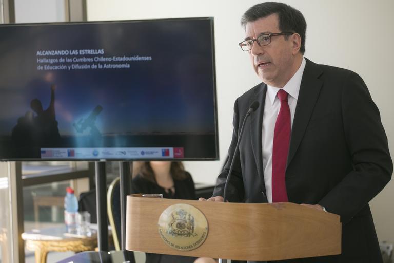 Keywords: people indoor “Alcanzando las Estrellas: Hallazgos de las Cumbres Chileno-Estadounidenses de Educación y Difusión de la Astronomía”, es el nombre del documento dado a conocer hoy y que representa el mayor esfuerzo nacional por coordinar estrategias en pos de potenciar la educación y difusión de la disciplina entre Chile y sus socios internacionales. Este informe sintetiza las ideas de más de cien expertos, representantes de 50 instituciones chilenas y extranjeras, que reconocieron el enorme potencial que posee Chile para convertirse en un referente mundial en educación y difusión pública de esta disciplina. Instituciones como los observatorios estadounidenses, conformados por AUI, AURA y Carnegie Institution for Science), la Embajada de Estados Unidos en Chile, CONICYT, Fundación Imagen de Chile y la Fundación Nacional de Ciencias de los Estados Unidos (NSF) participaron en las Cumbres Chileno-Estadounidenses de Educación y Difusión de la Astronomía. Para el año 2025 se proyecta que Chile poseerá el 75% de la capacidad de observación astronómica mundial. Con esta infraestructura no sólo se pueden responder preguntas que vinculan a la humanidad con el Universo, sino que el ser humano también es beneficiado educativamente en diversas áreas del saber. Para el embajador Gabriel Rodríguez, director de Energía, Ciencia y Tecnología e Innovación, del Ministerio de Relaciones Exteriores de Chile, “la astronomía no sólo permite responder preguntas sobre el origen de la vida y nuestro lugar en el cosmos, sino que además es una ciencia que nos acerca a la experiencia de transformar misterios ancestrales en conocimiento científico, a la vez que en saber cultural y sabiduría ciudadana, apropiados para hacer más humanos a todos los habitantes del planeta”. “El esfuerzo ofrecido por cada uno de los profesionales nacionales y extranjeros que aportaron generosamente su experiencia individual para agrupar los distintos puntos de vista de lo que está ocurriendo actualmente en materia de educación y difusión de la astronomía en Chile y el resto del mundo, constituye un recurso de gran utilidad para visibilizar buenas prácticas, y además favorece la futura colaboración entre quienes desarrollan iniciativas en esta área”, enfatizó el astrónomo Eduardo Hardy, que presentó el documento en representación de los observatorios estadounidenses. Las cumbres fueron visualizadas por los participantes como una oportunidad única para abordar, como comunidad, los problemas de coordinación y evaluación estratégica en la educación y difusión de la astronomía en Chile. Estas áreas de trabajo están desarrolladas en siete capítulos, y corresponden, por una parte, a la situación específica que experimenta en el plano nacional la educación y difusión de la astronomía en cinco campos ligados históricamente o en forma reciente con esta ciencia: la Educación Básica y Media; los planetarios, museos, centros de investigación y desarrollo científico y la educación no formal; los observatorios científicos internacionales; las universidades; y el astroturismo y los observatorios municipales y turísticos. Al final de cada capítulo se presenta un listado de recomendaciones y áreas de exploración futura, elaborado por cada grupo de trabajo. Las primeras se entienden como acciones concretas que, a juicio de los participantes, son posibles de implementar en el mediano y corto plazo. Las áreas de exploración futura, por su parte, corresponden a temas que requieren un mayor estudio y análisis antes de convertirse en recomendaciones factibles de ser implementadas. “Estamos conscientes que no sólo debemos centrar nuestra actividad en la entrega de fondos a los investigadores, para que lleven adelante proyectos a un nivel competitivo; también reconocemos la importancia y atractivo que despierta la disciplina en la sociedad. Por ello, pensamos que el rol de la astronomía en la educación de la ciencia debe transformarse en objetivo prioritario, en un tema clave para introducir un cambio”, comentó Christian Nicolai, director ejecutivo de CONICYT. Al finalizar la ceremonia, la profesora del Colegio Carlos Condell de la Haza, de La Serena, María Rebeca López, entregó a representantes de CONICYT el documento para que las recomendaciones y áreas de exploración que este texto incluye, sean puestas en acción con el respaldo de la principal institución pública del campo científico en Chile. "Estoy convencida que este documento será una brújula para nuestras autoridades a fin de potenciar y, ojala, priorizar a la astronomía como parte de nuestra identidad. Esta ciencia al alcance de mis estudiantes, contribuye e impulsa a que adquieran una visión mas amplia y enriquecedora del mundo en que les ha tocado vivir”, subrayó la docente. “Alcanzando las Estrellas: Hallazgos de las Cumbres Chileno-Estadounidenses de Educación y Difusión de la Astronomía”, es el nombre del documento dado a conocer hoy y que representa el mayor esfuerzo nacional por coordinar estrategias en pos de potenciar la educación y difusión de la disciplina entre Chile y sus socios internacionales. Este informe sintetiza las ideas de más de cien expertos, representantes de 50 instituciones chilenas y extranjeras, que reconocieron el enorme potencial que posee Chile para convertirse en un referente mundial en educación y difusión pública de esta disciplina. Instituciones como los observatorios estadounidenses, conformados por AUI, AURA y Carnegie Institution for Science), la Embajada de Estados Unidos en Chile, CONICYT, Fundación Imagen de Chile y la Fundación Nacional de Ciencias de los Estados Unidos (NSF) participaron en las Cumbres Chileno-Estadounidenses de Educación y Difusión de la Astronomía. Para el año 2025 se proyecta que Chile poseerá el 75% de la capacidad de observación astronómica mundial. Con esta infraestructura no sólo se pueden respond