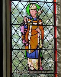 Keywords: Aldhelm.malmesbury.arp.jpg Stained glass window showing Aldhelm installed in Malmesbury Abbey in 1928 in memory of Rev Canon C D H McMillan who was Vicar of Malmesbury 1907 to 1919 <br> Taken by Adrian Pingstone in February 2005 and released to the public domain 2005-04-09 own assumed Arpingstone Aldhelm Aldhelm on stained glass windows Malmesbury Abbey stained glass Taken with Olympus C-750UZ |