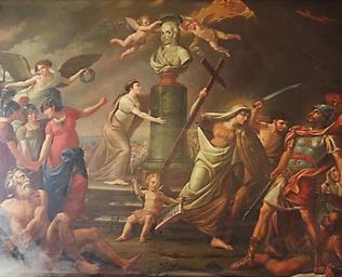 Keywords: Alegoria da Libertação de Portugal ao Jugo Francês (1813) - Arcângelo Fuschini.png en Allegory to the Liberation of Portugal from the French Yoke 1813 by Arcângelo Fuschini Property of the Ajuda National Palace on loan to the Constitutional Court since 1985 On the centre on a pedestal over a stone dais with three steps stands a bust of the Prince Regent which Lysia personification of Portugal embraces Two putti crown the bust with a laurel wreath To the left the three theological virtues Faith Hope and Charity are also about to be crowned in laurels and at their feet the Tagus looks on at the Prince By the pedestal sitting on one of the three stone steps the Genius of Patriotism holds broken shackles on his right hand and an open book on his left hand the Constitution Next to the small Genius the Christian Faith raises a golden shield with a bas-relief monstrance on it banishing the French enemy dressed like a Roman centurion Christian Faith wears an orange dress with long sleeves and a long white cape with a hood that covers her long wavy hair Next to her the bare-chested Lusitanian Genius raises his sword and strikes the enemy holding him by his cape so that he doesn't run away The French backs away with his sword down and looks up to the Heavens where a bolt of lightning appears to strike him With his right hand the French holds a manacle to which a child and a man are confined Above among the clouds the Hand of God holds a golden set of scales the weighing pan on Portugal's side heavier pt Alegoria da Libertação de Portugal ao Jugo Francês 1813 por Arcângelo Fuschini Propriedade do Palácio Nacional da Ajuda em depósito no Tribunal Constitucional desde 1985 Ao centro num pedestal sobre um estrado em pedra de três degraus destaca-se um busto do PrÃncipe Regente para o qual LÃsia estende os braços Dois querubins aproximam-se do busto para o coroar de louros à esquerda encontramos as três virtudes teologais a Fé a Esperança e a Caridade também elas prestes a serem coroadas de louros e aos pés delas encontramos o Tejo que olha para o busto do PrÃncipe Regente Junto do pedestal sentado num dos três degraus de pedra o Génio do Patriotismo segura correntes partidas na mão direita e um livro de capa vermelha aberto na mão esquerda a Constituição Ao lado do pequeno Génio a Fé Cristã ergue um escudo dourado com custódia em relevo e avança sobre o inimigo gaulês que se encontra vestido como um centurião romano A Fé Cristã usa um vestido de tonalidade alaranjada de mangas compridas e uma capa branca que chega aos pés com capuz que lhe cobre a cabeça de cabelos ondulados e soltos; está acompanhada do Génio Lusitano que de tronco nu e espada erguida investe na direcção do inimigo e segura-o com firmeza pela capa impedindo-o de fugir O Gaulês recua de espada em baixo na mão esquerda e olha para o céu de onde surge um raio que o atinge Segura com a mão direita atrás de si a argola onde estão agrilhoados uma criança e um homem que se encontra caÃdo por terra Ainda no plano celestial por entre as nuvens vislumbra-se a mão de Deus que segura uma balança dourada cujo prato mais pesado pende para o lado de Portugal adivinhando-se desta forma a vitória lusitana sobre o ocupante francês 1813 https //repositorio ul pt/bitstream/10451/24522/2/ulfl207968_tm_vol_2 pdf GONÇALVES Mónica 2016 Arcangelo Fuschini 1771 - 1834 e a pintura do Neoclassicismo em Portugal 2 º Vol Mestrado em Arte Património e Teoria do Restauro Faculdade de Letras da Universidade de Lisboa - Instituto de História da Arte Creator Arcângelo Fuschini other versions Custom license marker 2016 12 27 PD-old-100 1813 paintings 1810s paintings from Portugal Arcângelo Fuschini 1813 in Portugal Peninsular War John IV of Portugal 19th-century allegorical paintings ImageNote 1 264 360 97 148 721 584 2 Génio do Patriotismo ImageNoteEnd 1 ImageNote 2 320 418 75 75 721 584 2 A Constituição ImageNoteEnd 2 ImageNote 3 405 177 128 228 721 584 2 Fé Cristã ImageNoteEnd 3 ImageNote 4 532 165 101 160 721 584 2 Génio Lusitano ImageNoteEnd 4 ImageNote 5 607 191 113 141 721 584 2 Exército Francês ImageNoteEnd 5 ImageNote 6 225 162 108 153 721 584 2 LÃsia ImageNoteEnd 6 ImageNote 7 313 39 93 121 721 584 2 PrÃncipe Regente ImageNoteEnd 7 ImageNote 8 6 346 110 203 721 584 2 Tejo ImageNoteEnd 8 ImageNote 9 1 180 170 134 721 584 2 As Três Virtudes Teologais a Fé a Esperança e a Caridade ImageNoteEnd 9 ImageNote 10 637 348 83 175 721 584 2 O Povo Oprimido ImageNoteEnd 10 ImageNote 11 334 186 52 62 721 584 2 Armas do Reino de Portugal ImageNoteEnd 11 ImageNote 12 451 1 74 42 721 584 2 A Mão de Deus segurando uma balança cujo prato mais pesado pende para o lado de Portugal ImageNoteEnd 12 |