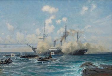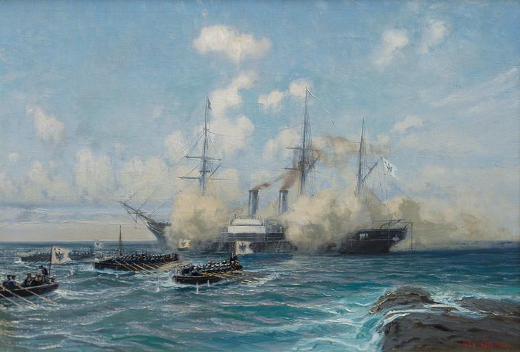 Keywords: Alexander Kircher - Dampfsegler der kaiserlichen Flotte.jpg Artwork Creator Alexander Kircher Ein Kriegsschiff unter der Flagge der preußischen Marine Die Flagge stimmt nicht mit dem Titel Dampfsegler der kaiserlichen Flotte überein Vermutlich handelt es sich um die als Gefecht bei Tres Forcas bekanntgewordene Landung am 7 August 1856 In diesem Falle ist das dargestellte Kriegsschiff die Korvette Danzig oil canvas cm 70 5 100 object history credit line accession number http //www auktionshaus-stahl de/298/items/dampfsegler-der-kaiserlichen-flotte html www auktionshaus-stahl de <gallery>File Alexander Kircher Kriegsmarine jpg</gallery> Alexander Kircher Sail-steamers of Germany Ships of the Prussian Navy Danzig Naval battles involving Prussia Tres Forcas PD-old-auto 1939 |
