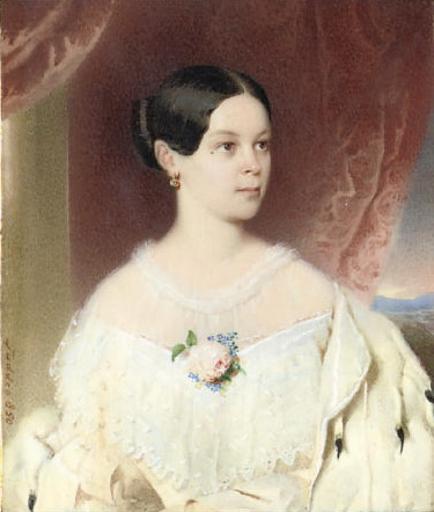 | Keywords: Alexandra Iosifovna by T.Mayer (priv.coll.).jpg Grand Duchess Alexandra Iosifovna 1830-1911 in white dress with large lace collar pink rose and blue flowers at corsage an ermine cloak over her left shoulder gold and pearl earring her dark hair swept back; window and crimson curtain background signed and dated 'Taddeo 850' lower left rectangular 4 5/8 x 3 15/16 in 118 x 100 mm gilt-metal mount within green velvet frame http //www christies com/lotfinder/paintings/fr-taddaus-mayer-grand-duchess-alexandra-iosif-5003564-details aspx from searchresults intObjectID 5003564 sid 31669af6-37c5-4b96-830b-b581248ba666 1850 FR TADDÄUS MAYER BOHEMIAN 1814-1856 Alexandra Iosifovna of Altenburg in portraits Files uploaded by Shakko from various sources Images from Christie's Private collections of Russian art Ermine clothing in art Thaddaus Mayer PD-old |