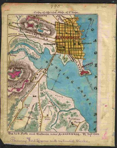 | Keywords: Alexandri-Forts-vhs00110-1-.jpg en Shows the locations of Union fortifications surrounding Alexandria Va including forts Lyon and Ellsworth in Fairfax County The locations of Hunting Creek and the Potomac River are also indicated Library of Congress Virginia Historical Society Henry Knox Snedon 1861-1865 PD-old Fort Lyon Virginia Fort Ellsworth |