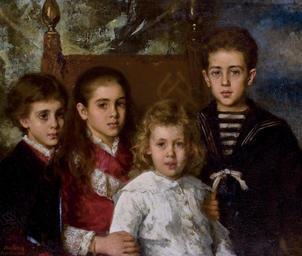 Keywords: Alexei Harlamoff (1840-1925) - Portrait of the children of Paul Pavlovich Demidoff.jpg en Portrait of four children from the second marriage of Paul Pavlovich Demidoff 2nd Prince of San Donato 1839-1885 Avrora 1873-1904 Anatoli 1874-1943 Maria 1876-1955 and Pavel 1879-1909 signed inscribed and dated 'Harlamoff/Pratolino 1883 ' lower left oil on canvas 76 5 x 90 cm Christie's online 5321895 Creator Alexei Harlamov 1883 House of Demidov Anatoliy Pavlovich Demidov Avrora Pavlovna Demidova Maria Pavlovna Abamelik-Lazareva Demidova Alexei Harlamov Children in Russian portraits Family portraits of Russia PD-old-auto 1923 |