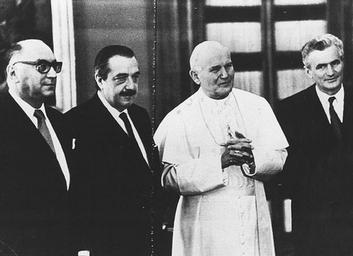 Keywords: Alfonsin y Juan Pablo II.jpg es Juan Pablo II y el presidente Alfonsín en compañía del ministro de Economía Bernardo Grinspun y del embajador argentino ante la Santa Sede Santiago Nahuel de Estrada http //www lanacion com ar/fotos/itemgaleria asp galeria_id 631 foto_nro 7 La Nación Archivo 1984-10-25 PD-AR-Photo Not-PD-US-URAA Raúl Alfonsín Ioannes Paulus II in 1984 Ioannes Paulus II with national leaders Black and white photographs of men |
