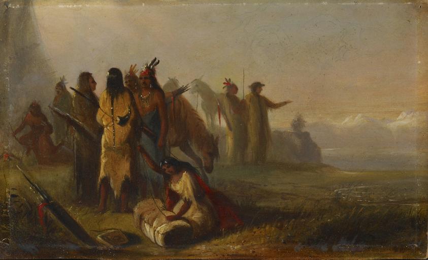 | Keywords: Alfred Jacob Miller - Scene of Trappers and Indians - Walters 372772.jpg This painting was unknown until offered as a gift and did not appear in the Miller catalogue raisonné compiled by the Walters and the Amon Carter Museum in 1981 In the foreground the woman is cording a bale of dried meat while in the background Captain William Drummond Stewart identified by his broad rimmed hat addresses a male figure It was Miller's practice to repeat his subjects for many clients This work however is almost unique There is a pen- and ink- sketch in a private collection that came assembled for Stewart Otherwise the only other variant is Walters 37 1940 153 What is atypical about this painting is that it is very thinly painted on artist's board rather than canvas Pentimenti in the sky have become visible allowing the viewer to determine how the artist developed the composition Miller has apparently considered inserting a tree as he had in the other Walters watercolor and then rejected the idea Since this painting has not been identified with any listing in the artist's account book it could be an early work dating from before 1842 before 1842 oil on artist's board cm 17 78 30 48 ; framed cm 36 83 48 9 5 72 accession number 37 2772 8583 Louise Lunger Meyers early 20th century by inheritance Bernadette McMenamin and Michele Whelan by inheritance executors of Meyers estate Walters Art Museum Gift of Bernadette McMenamin and Michele Whelan in memory of Louise L Meyers 2006 place of origin USA Walters Art Museum license 2D 19th-century watercolor paintings in the United States Paintings of Native Americans by Alfred Jacob Miller Paintings by Alfred Jacob Miller in the Walters Art Museum |