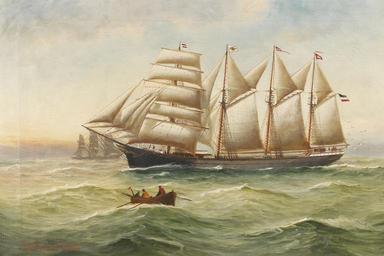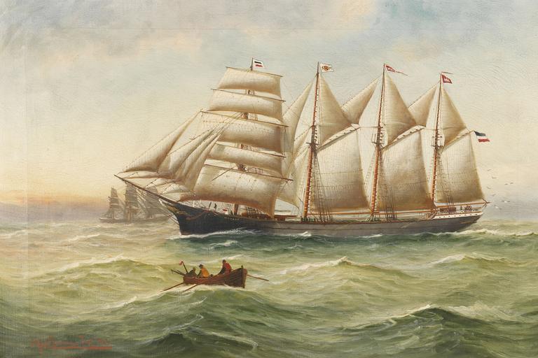 Keywords: Alfred Jensen - Hamburger Viermastbarkentine "Mozart" (1913).jpg Artwork Creator Alfred Jensen Neben der Deutschen und Hamburger Flagge weht am Topp die Reedereiflagge von Schlüter Maack Erst ab 1903 ließ die Reederei A C de Freitas Co wieder Segelschiffe laufen darunter auch die beiden Schwesternschiffe Beethoven und Mozart die als stählerne Viermastbarkentinen in Greenock von der Grangemouth Greenock Dockyard Co erbaut wurden Es waren frachtfahrenden Schulschiffe 1910/11 gab de Freitas die Reederei auf und verkaufte die Mozart an Schlüter Mack in Hamburg Unter den Kapitänen P Justi und F Weiermann segelte das Schiff im Salpeterdienst Im 1 Weltkrieg in Chile festgelegt ging der Segler 1921 an Hugo Lundquist in Mariehamn 1935 wurde er in England abgewrackt 1913 oil canvas cm 50 75 object history Alfred Jensen Prof 1913 ~ lower left signature / date http //www kettererkunst de/kunst/kd/details php obnr 411400723 anummer 414 detail 1 Ketterer Kunst Ž Ž Hamburg 19 /20 05 2014 lot 1322 Other versions PD-old-auto-1923 1935 DEFAULTSORT Jensen Alfred; Marine; Ketterer 2014 Alfred Jensen marine painter Mozart ship 1904 Oil paintings of watercraft 20th-century sailing ships in paintings Oil paintings of seascapes Images from Ketterer Kunst |