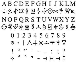 | Keywords: Alien decoder Futurama.svg A table of one of the alien alphabets used in Futurama TV cartoon show made by using the standard Times Roman font and the Futurama Alien Alphabet One v1 6 font by Darrell Johnson Leandro Pardini available at http //www futurama-madhouse net/fonts/index shtml Futurama-Madhouse The layout of this table was influenced by Alien_decoder png by en User WillMak050389 though not the same Now updated with a version of the question-mark character see en File_talk Alien_decoder_Futurama svg File Alienese jpg etc Self-made using fonts 2009-07-24 This version by User AnonMoos previous version by User The New Mikemoral PNG by en User WillMak050389 AnonMoos Fictional alphabets Futurama Alphabet charts |