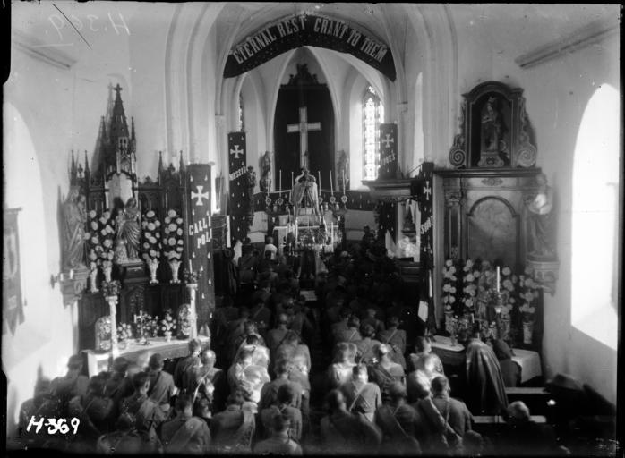 | Keywords: blackandwhite monochrome black and white Soldiers of the 2nd Brigade at an All Souls memorial funeral service requiem mass to commemorate the New Zealand fallen, St Martin's Church, Selles, Pas De Calais, France. Photograph taken 5 November 1917 by Henry Armytage Sanders. Inscriptions: Inscribed - Photographer's title on negative -bottom left: H369. The requiem mass was followed by a burial service in the churchyard. Quantity: 1 b&w original negative(s). Physical Description: Dry plate glass negative 4.75 x 6.5 inches All Souls Day memorial funeral service requiem mass, St Martin's Church, Selles, Pas de Calais, France. Royal New Zealand Returned and Services' Association :New Zealand official negatives, World War 1914-1918. Ref: 1/2-013003-G. Alexander Turnbull Library, Wellington, New Zealand. natlib.govt.nz/records/22780580 Soldiers of the 2nd Brigade at an All Souls memorial funeral service requiem mass to commemorate the New Zealand fallen, St Martin's Church, Selles, Pas De Calais, France. Photograph taken 5 November 1917 by Henry Armytage Sanders. Inscriptions: Inscribed - Photographer's title on negative -bottom left: H369. The requiem mass was followed by a burial service in the churchyard. Quantity: 1 b&w original negative(s). Physical Description: Dry plate glass negative 4.75 x 6.5 inches All Souls Day memorial funeral service requiem mass, St Martin's Church, Selles, Pas de Calais, France. Royal New Zealand Returned and Services' Association :New Zealand official negatives, World War 1914-1918. Ref: 1/2-013003-G. Alexander Turnbull Library, Wellington, New Zealand. natlib.govt.nz/records/22780580 |
