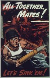Keywords: All together, mates^ Let's sink 'em^ - NARA - 513779.jpg Scope and content General notes 513779 Local identifier 44-PA-332 Office for Emergency Management Office of War Information Domestic Operations Branch Bureau of Special Services 03/09/1943 - 09/15/1945 NARA-Author Packer poster artist Artist 8467744 <br /> Still Picture Records Section Special Media Archives Services Division NWCS-S National Archives at College Park 8601 Adelphi Road College Park MD 20740-6001 1941 - 1945 Record group Record Group 44 Records of the Office of Government Reports 1932 - 1947 Record group ARC 373 World War II Posters compiled 1942 - 1945 Series ARC 513498 File unit File unit ARC Variant control numbers NAIL Control Number NWDNS-44-PA-332 Other versions <gallery> File All_together _mates _Let's_sink_'em _-_NARA_-_513779 tif tif File All_together _mates _Let's_sink_'em _-_NARA_-_513779 jpg jpg </gallery> NARA-cooperation PD-USGov World War II posters from the United States |