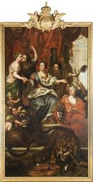 Keywords: Allegori över konung Karl XIs fredliga regeringr (David Klöcker Ehrenstrahl) - Nationalmuseum - 174872.tif I mitten på en tron under ett rött draperi med Karl XI s namnchiffer sitter Svea iklädd diadem klänning av guldtyg samt blå kronströdd hermelinsmantel Hon förenar med sin högra hand Rättvisan och Freden som med en kyss beseglar sin vänskap medan hennes vänstra arm understöds av Försiktigheten vilken håller en spegel i handen och åtföljd av Beständigheten hållande i en kolonn Vid Sveas fötter sitter till höger Välmågan i rödgul klänning och röd mantel hållande ett ymnighetshorn bakom henne skymter ett lejon lekande med fredens fyra små barn I förgrunden ett annant lejon som tuggar sönder krigiska emblem i bakgrunden till höger en utblick mot ett hörn av Stockholms slott invid vilket skymta fanor och skeppsmaster header I mitten på en tron under ett rött draperi med Karl XI s namnchiffer sitter Svea iklädd diadem klänning av guldtyg samt blå kronströdd hermelinsmantel Hon förenar med sin högra hand Rättvisan och Freden som med en kyss beseglar sin vänskap medan hennes vänstra arm understöds av Försiktigheten vilken håller en spegel i handen och åtföljd av Beständigheten hållande i en kolonn Vid Sveas fötter sitter till höger Välmågan i rödgul klänning och röd mantel hållande ett ymnighetshorn bakom henne skymter ett lejon lekande med fredens fyra små barn I förgrunden ett annant lejon som tuggar sönder krigiska emblem i bakgrunden till höger en utblick mot ett hörn av Stockholms slott invid vilket skymta fanor och skeppsmaster 1693 Oil on canvas Olja på duk Size cm 205 dager359 Institution Nationalmuseum Stockholm Drottningholms slott Signerad Dd Klöcker Ehrenstrahl 1695 till höger accession number 174872 NMDrh 130 place of creation Q34 Linn Ahlgren / Nationalmuseum Nationalmuseum Stockholm cooperation project Licensed-PD-Art PD-old-auto PD-Nationalmuseum_Stockholm 1698 Media contributed by Nationalmuseum Stockholm 2016-10 Media contributed by Nationalmuseum Stockholm connect to wikidata item Paintings in the Nationalmuseum Stockholm Paintings at Royal Domain of Drottningholm David Klöcker Ehrenstrahl |