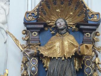 Keywords: Allmannshofen Kloster holzen 0021.JPG Johannes-Nepomuk-Statue polychrom im Kloster Holzen einem ehemaligen Kloster der Benediktinerinnen in Allmannshofen in Bayern in der Diözese Augsburg en Altar of St John of Nepomuk Holzen Abbey is a Benedictine abbey near the village of Allmannshofen in Bavaria Germany Own Mattana 2009-04-08 Images by Mattana-Allmannshofen Germany Images by Mattana-Statues of Christian saints John of Nepomuk Klosterkirche St Johannes der Täufer Holzen Baroque statues of John of Nepomuk in Swabia administrative region |