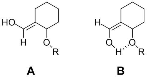 Keywords: Allylic strain and hydrogen bonding.png chemical en A represents the conformation that would occur in most situations due to allylic strain However as shown in B a hydrogen bond can form that is energetically favorable and cancels the unfavorable allylic strain Thus B is the most stable conformation own Chem540f09grp10 2009-12-01 Hydrogen bonding Allylic strain |